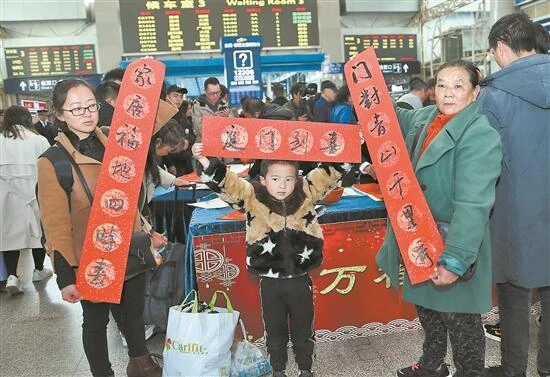 圖為中國鐵路昆明局集團公司在昆明站候車大廳開展《金花送萬福》活動,鐵路書法愛好者現(xiàn)場為旅客寫春聯(lián)送祝福。(記者 胡曉蓉 李承韓 張彤)