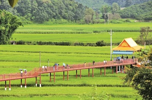 翠綠的稻田、紅色的景觀橋、金黃色的涼亭,與山水田園融為一體。芒市風平鎮介桃村,秀美的鄉村風光讓人流連忘返。
