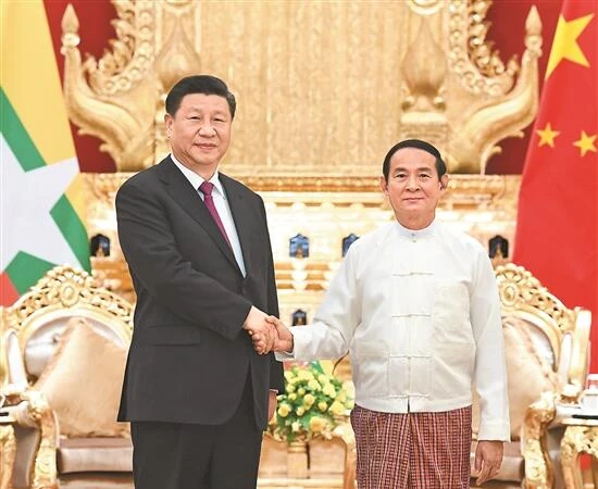 習近平強調,我們剛剛慶祝新中國成立70周年。70年來,中國取得巨大發展成就的實踐證明,中國人民選擇的發展道路是成功的,我們將繼續堅定不移地走下去。對中國的未來,我們充滿信心。中國將堅持和平發展,堅持永不稱霸。為此,我提出推動構建人類命運共同體,希望這個地球村里的各國能夠和睦相處、互利共贏。構建人類命運共同體,首先從周邊做起,堅持睦鄰安鄰富鄰。中國開展對外合作從不強加于人,從不干涉別國內政,反對你輸我贏、單邊通吃。中方愿同緬方在共建“一帶一路”框架下穩步推進中緬經濟走廊重點合作項目的建設,更多惠及當地人民,使他們有更多的獲得感和幸福感。中方也將繼續在國際舞臺上堅定支持緬甸維護合法權益和國家尊嚴。