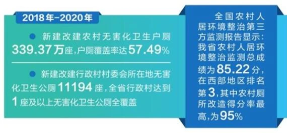 截至2020年底,全省農村無害化衛(wèi)生戶廁覆蓋率已達到57.49%,比3年前提高了32個百分點,全省行政村均達到了1座及以上無害化衛(wèi)生公廁全覆蓋,農民群眾的如廁環(huán)境及條件得到明顯改善。據全國農村人居環(huán)境整治第三方監(jiān)測報告顯示,我省農村人居環(huán)境整治監(jiān)測總成績?yōu)?5.22分,在西部地區(qū)排名第3,其中農村廁所改造得分率最高,為95%。