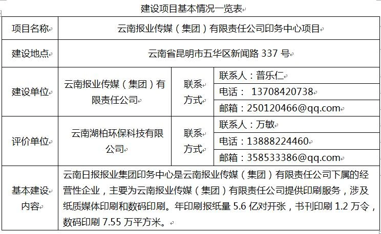 我單位在云南省昆明市五華區(qū)新聞路337號(hào)建設(shè)云南報(bào)業(yè)傳媒(集團(tuán))有限責(zé)任公司印務(wù)中心項(xiàng)目,現(xiàn)已委托云南湖柏環(huán)保科技有限公司編制了《云南報(bào)業(yè)傳媒(集團(tuán))有限責(zé)任公司印務(wù)中心項(xiàng)目環(huán)境影響報(bào)告表》。