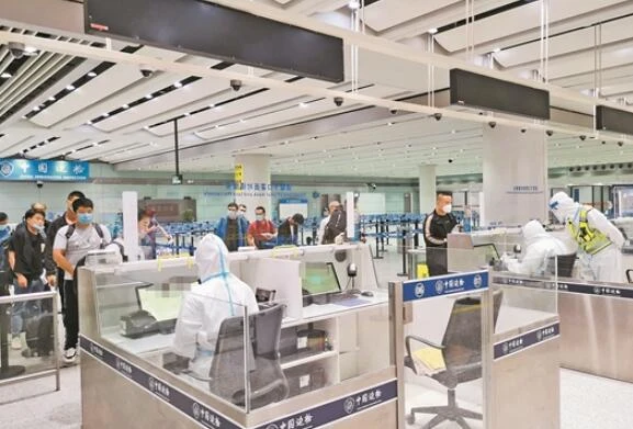 昆明出入境邊防檢查站民警穿著抗疫防護服在長水機場邊檢大廳工作。 昆明出入境邊防檢查站供圖