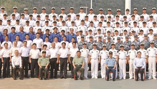 4月23日,海軍三型主戰艦艇——長征18號艇、大連艦、海南艦在海南三亞某軍港集中交接入列。中共中央總書記、國家主席、中央軍委主席習近平出席交接入列活動并登上艦艇視察。