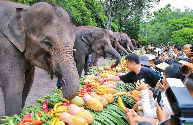 3噸多的各種水果和玉米等呈一字形堆放,隨著一聲哨響,16頭亞洲象井然有序地享用起節(jié)日大餐;游客紛紛上前給大象喂食、合影留念,現(xiàn)場(chǎng)一派溫馨和諧景象。