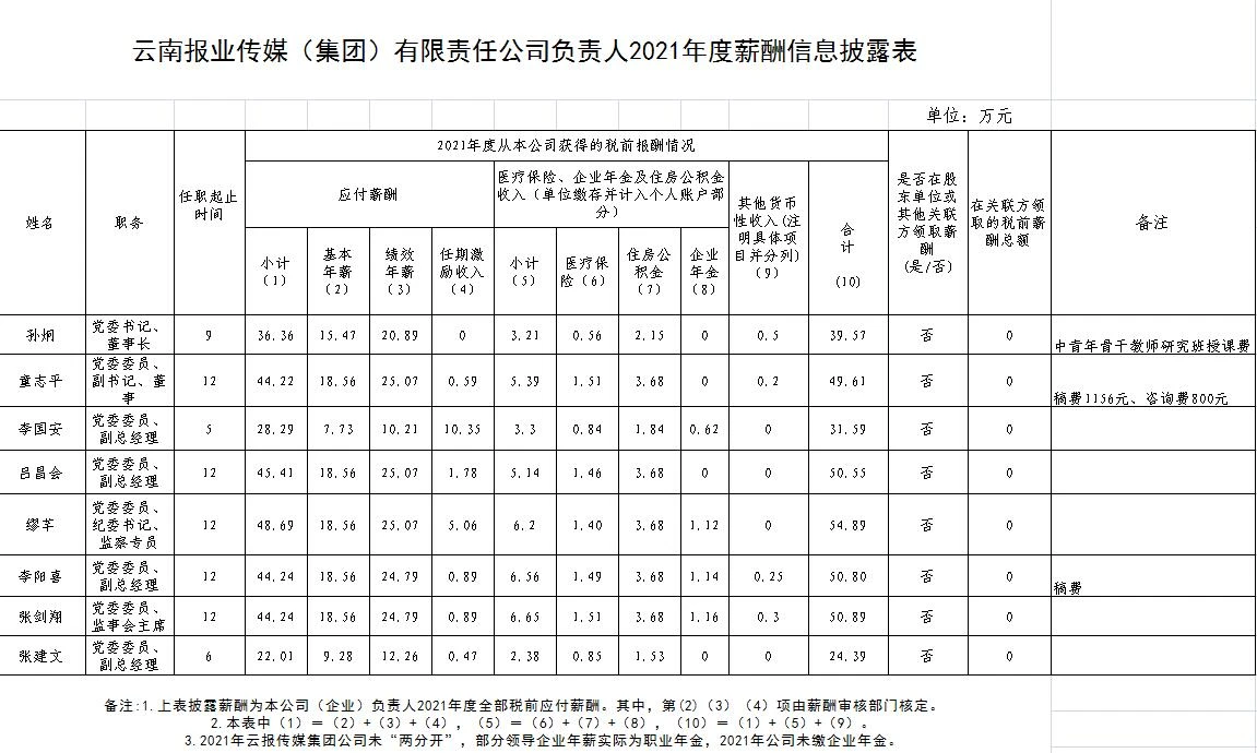 云南報業傳媒(集團)有限責任公司負責人2021年度薪酬信息披露表