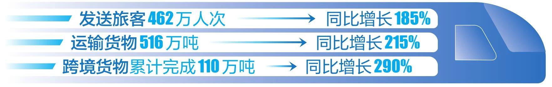 今年以來,中老鐵路呈現客貨兩旺發展態勢。一季度,中老鐵路累計發送旅客462萬人次,同比增長185%;累計運輸貨物516萬噸,同比增長215%;跨境貨物累計完成110萬噸,同比增長290%。