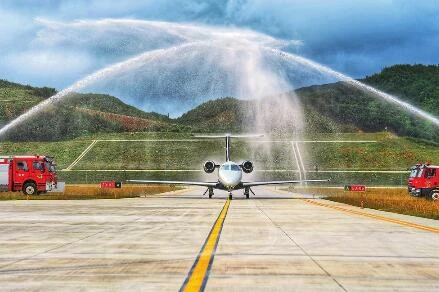 9月26日上午10時(shí)10分,一架飛鴻300飛機(jī)降落在鳳慶中和機(jī)場(chǎng)后緩緩?fù)ㄟ^(guò)“水門(mén)”,鳳慶中和通用機(jī)場(chǎng)正式投入使用。至此,臨滄市成為全省首個(gè)擁有3個(gè)機(jī)場(chǎng)的州市。