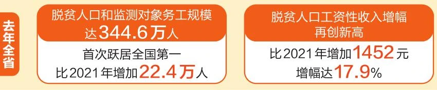 2月1日,記者從全省脫貧人口穩崗就業工作視頻會議上獲悉,去年全省脫貧人口和監測對象務工規模達344.6萬人,首次躍居全國第一,比2021年增加22.4萬人;脫貧人口工資性收入增幅再創新高,達9538元,比2021年增加1452元,增幅達17.9%。