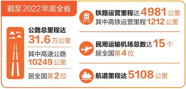 截至2022年底,全省公路總里程達31.6萬公里,其中高速公路10249公里、居全國第2位,實現120個縣通高速公路、129個縣全部通高等級公路;2022年累計新改建農村公路1.9萬公里,其中374個現代化邊境小康村自然村實現100%通硬化路,農村公路總里程預計達到27.9萬公里,居全國第2位;國省干線和大滇西旅游環線交通項目建設穩步推進,孔雀山隧道貫通,德貢公路提升完善工程全線通車。全省鐵路運營里程達4981公里,其中高鐵運營里程1212公里。13個州(市)通鐵路,其中8個州(市)通高鐵動車。大瑞鐵路保瑞段建設有序推進,渝昆高鐵云南段全面開工,大理鐵路樞紐工程開工建設。新建蒙自機場、遷建昭通機場等項目建設全力推進,13個支線機場加快提升改造。民用運輸機場總數達15個、居全國第4位。航道里程達5108公里,右江百色水利樞紐通航設施、東川港、水富港擴能工程正有序推進。