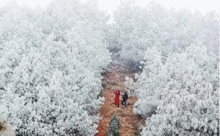 近日,受冷空氣影響,祿勸彝族苗族自治縣馬鹿塘花海景區出現霧凇奇觀,漫山遍野銀裝素裹美如畫卷,吸引了許多市民上山觀賞。