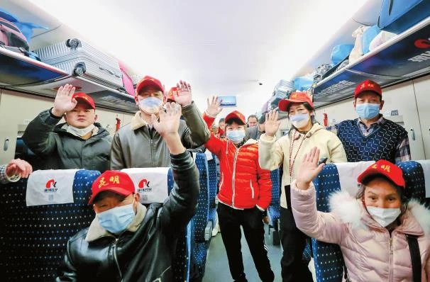 1月30日上午,昆明市100余名出省務工人員乘坐“昆明—上海”“昆明—福州”號務工專列,前往上海、浙江、福建返崗務工。昆明市還將繼續開行返崗復工專列、專車,有組織、成規模集中輸送農村勞動力,讓更多外出務工人員快速返崗。(記者 胡妤雅 王璐瑤 攝)