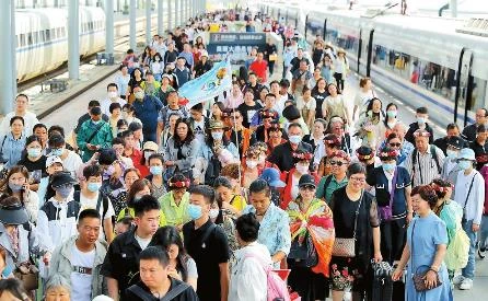端午假期前夕,云南鐵路迎來客流高峰,探親、旅游團隊及放假學生出行客流明顯增長。圖為6月21日大理東站站臺的旅客。(記者 楊崢 陳飛 攝