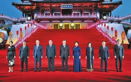 5月18日晚,國(guó)家主席習(xí)近平和夫人彭麗媛在陜西省西安市大唐芙蓉園為出席中國(guó)—中亞峰會(huì)的中亞國(guó)家元首夫婦舉行歡迎儀式和歡迎宴會(huì)。宴會(huì)后,習(xí)近平夫婦同貴賓們共同觀看中國(guó)同中亞國(guó)家人民文化藝術(shù)年暨中國(guó)—中亞青年藝術(shù)節(jié)開(kāi)幕式演出。這是習(xí)近平夫婦在紫云樓前同貴賓合影留念。新華社記者 丁海濤 攝