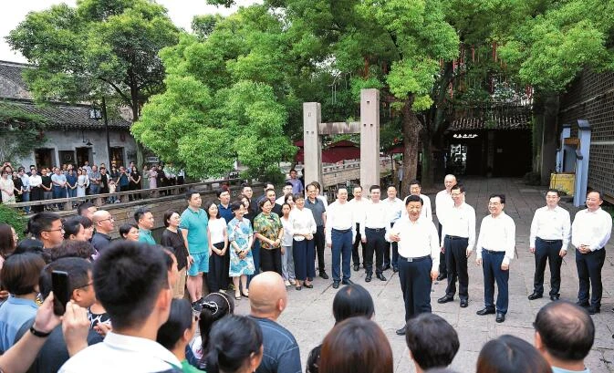 7月5日至7日,中共中央總書記、國家主席、中央軍委主席習近平在江蘇考察。這是6日上午,習近平在蘇州平江歷史文化街區(qū),同當?shù)鼐用窈陀慰陀H切交流。新華社記者 燕雁 攝