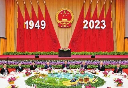 人民大會堂宴會廳華燈璀璨、鮮花綻放,洋溢著喜慶熱烈的節(jié)日氛圍。主席臺上方高懸著莊嚴(yán)的國徽,“1949-2023”大字年號在鮮艷的紅旗映襯下格外醒目。