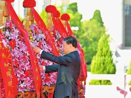 9月30日上午,黨和國家領導人習近平、李強、趙樂際、王滬寧、蔡奇、丁薛祥、李希、韓正等來到北京天安門廣場,出席烈士紀念日向人民英雄敬獻花籃儀式。這是習近平整理花籃上的緞帶。新華社記者 殷博古 攝