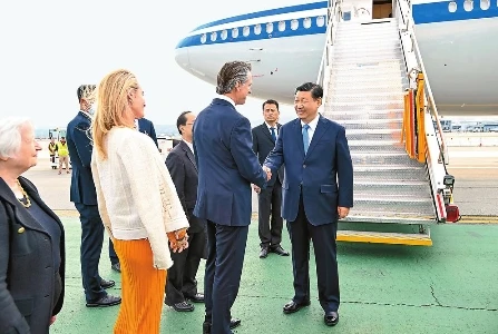 習近平乘坐專機抵達舊金山國際機場時,受到美國加利福尼亞州州長紐森、財政部長耶倫等美方代表熱情迎接。