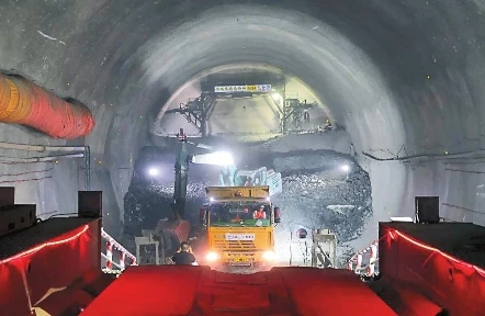 自2022年3月28日開工以來,國鐵昆明局滇中鐵路建設指揮部每月召開施工分析會和安全風險研判會,通過優化開挖支護措施和強化重點工序管控,確保隧道建設有序推進。為確保隧道施工安全質量可控,且不影響滬昆高鐵正常運營,國鐵昆明局滇中鐵路建設指揮部組織參建各方成立隧道攻關團隊,選擇在滬昆高鐵夜間停輪后進行機械開挖,并使用智能裝備實時檢測隧道變形和振動,隧道每月開挖進尺達70米左右,全隧比計劃工期提前1年貫通。