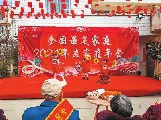 家庭年會現場氣氛熱烈,家庭成員自編自導自演的舞蹈《幸福中國年》《童心向黨》、詩歌朗誦《彩色的中國》、古箏等樂器演奏、古詩詞及成語接龍等精彩節目輪番上演,現場傳來陣陣掌聲、喝彩聲。其間,4歲的家庭成員孫榮茜小朋友一字不落地背誦家訓,在稚嫩童聲中傳承愛黨愛國愛家的好家風。
