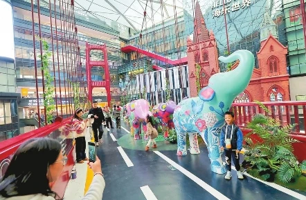 走進昆明海樂世界購物中心,形態各異、色彩繽紛的萌象群沿著時光塔橋錯落排開,以藝術展覽形式呈現云南亞洲象群集體北遷場景,引得市民游人駐足觀賞、打卡拍照。