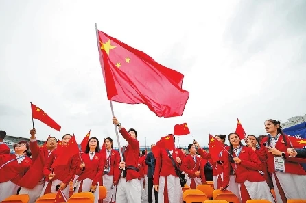 中國體育代表團(tuán)參加了運(yùn)動員入場儀式,乒乓球運(yùn)動員馬龍和花樣游泳運(yùn)動員馮雨擔(dān)任旗手。