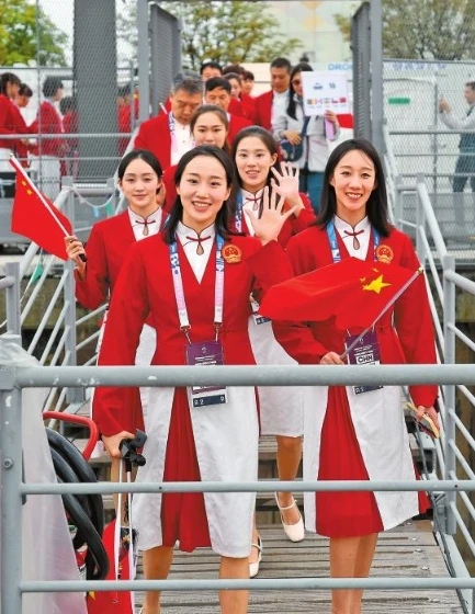 中國體育代表團(tuán)成員在開幕式前登船。新華社記者 曹燦 攝