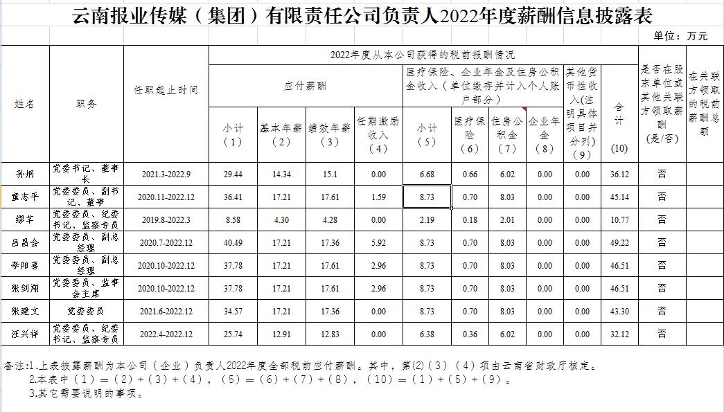 云南報(bào)業(yè)傳媒(集團(tuán))有限責(zé)任公司負(fù)責(zé)人2022年度薪酬信息披露表