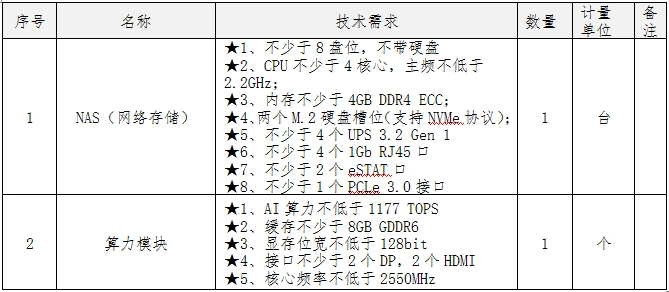 2.2采購內容:緊急增補一臺NAS(網絡存儲)和一個算力模塊。技術參數如下: