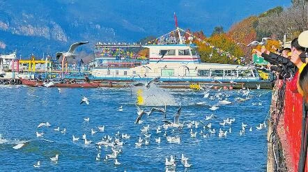 “哇!好美好暖和呀。波光粼粼的滇池,惹人喜愛的紅嘴鷗,和我們家鄉(xiāng)比,別有一番景致。”來自哈爾濱的游客張靈笑著說。春城昆明暖意融融,海埂大壩上人山人海。西山前,來這里過冬的西伯利亞紅嘴鷗圍著滿載乘客的“滇池和諧號”游船飛舞,海埂大壩上擠滿了喂鷗觀景的游客,人鷗嬉戲成為冬日春城一道亮麗的風(fēng)景。