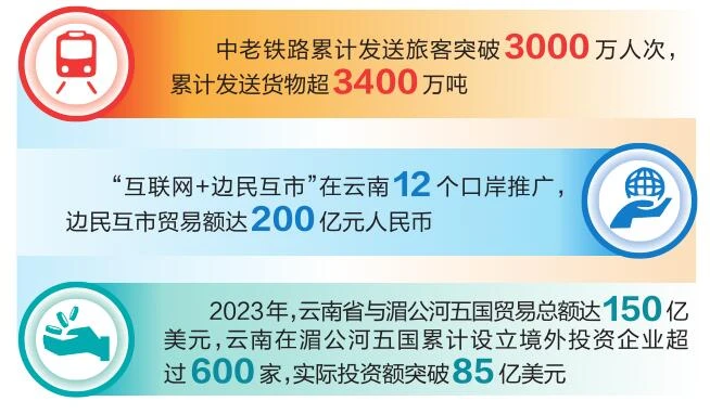 加強互聯,與各國共建綜合立體交通網。中老鐵路累計發送旅客突破3000萬人次,累計發送貨物超3400萬噸。創新開行“滬滇·瀾湄線”“云貴·瀾湄線”“瀾湄蓉渝歐快線”“中歐+瀾湄線”國際貨運班列,國際大通道效應日益顯現。云南企業投資、建設、運營的柬埔寨暹粒吳哥國際機場于2023年10月通航運營。中越跨境標準軌鐵路聯通、中緬鐵路通道、中老高速等區域互聯互通項目穩步推進。