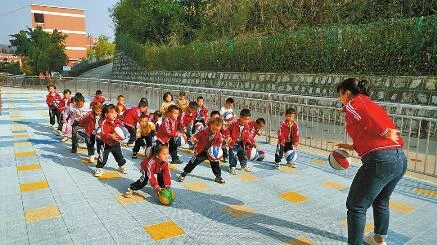 中寨幼兒園的老師給孩子們上體育課。