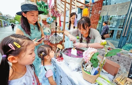 游客在西山區大悅城國風雅集觀看非遺漆扇制作。 記者 胡妤雅 攝