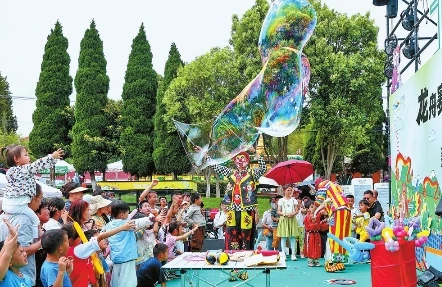 安寧市玉龍灣景區里,小丑演員在金塔廣場表演花樣泡泡。記者 胡妤雅 攝