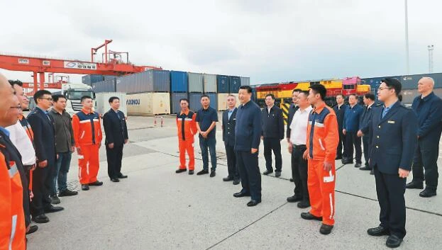 隨后,習(xí)近平來到重慶鐵路集裝箱中心站,聽取貨物集散、運(yùn)輸路徑、運(yùn)營(yíng)成本和效益等介紹,同貨車司機(jī)、列車司機(jī)、裝卸工人、場(chǎng)站管理人員等親切交流,詢問他們的工作強(qiáng)度、勞動(dòng)保護(hù)、節(jié)假日休息和收入情況。習(xí)近平說,大家在物流一線,也是在對(duì)外開放一線,通過你們的辛勤勞動(dòng),很多商品跨越山海、走向世界,你們的工作很有意義。推動(dòng)西部大開放、促進(jìn)西部大開發(fā),物流很重要,大家要繼續(xù)努力,不斷創(chuàng)造新的業(yè)績(jī),作出新的貢獻(xiàn)。