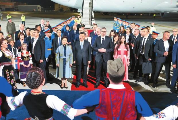 武契奇在機(jī)場(chǎng)為習(xí)近平舉行獨(dú)具特色的迎賓儀式。塞爾維亞少年兒童向習(xí)近平和彭麗媛獻(xiàn)花,揮舞中塞兩國國旗,身著民族盛裝的塞爾維亞民眾載歌載舞熱烈歡迎。