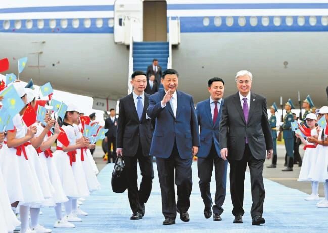 專機抵達阿斯塔納納扎爾巴耶夫國際機場時,哈薩克斯坦總統托卡耶夫率政府第一副總理斯克利亞爾、副總理兼外長努爾特列烏、總統外事顧問卡濟漢、阿斯塔納市長卡瑟姆別克等高級官員熱情迎接。身著盛裝的哈薩克斯坦女青年向習近平獻花。