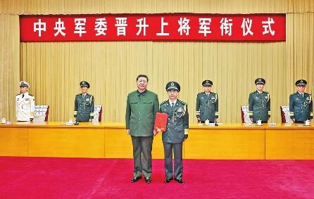 下午4時許,晉銜儀式在莊嚴的中華人民共和國國歌聲中開始。中央軍委副主席張又俠宣讀了中央軍委主席習近平簽署的晉升上將軍銜命令。中央軍委副主席何衛東主持晉銜儀式。
