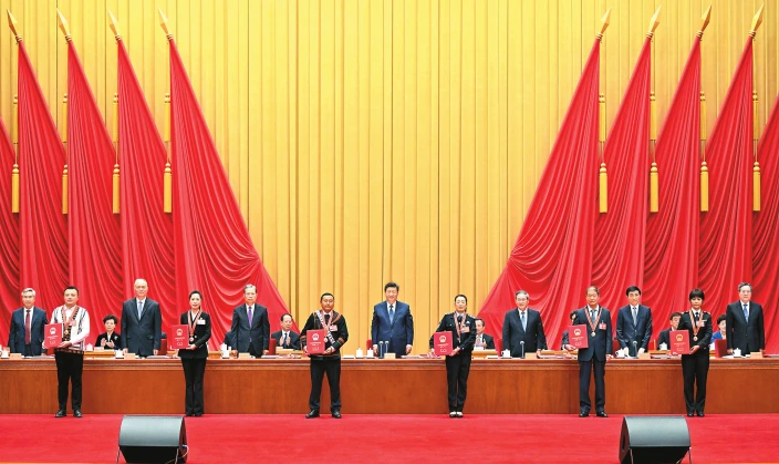 在歡快的樂曲聲中,習(xí)近平等為受表彰的模范個人和模范集體代表頒獎。