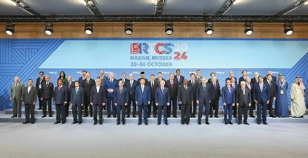 當地時間10月24日上午,國家主席習近平在喀山會展中心出席“金磚+”領導人對話會并發表題為《匯聚“全球南方”磅礴力量 共同推動構建人類命運共同體》的重要講話。這是出席對話會的金磚國家及嘉賓國領導人或代表、國際組織負責人集體合影。 新華社記者 姚大偉 攝