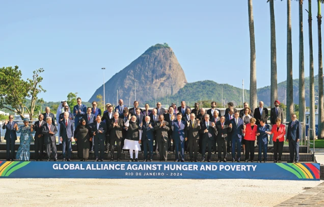當地時間11月18日上午,國家主席習近平在巴西里約熱內盧出席二十國集團領導人第十九次峰會。峰會把“構建公正的世界和可持續的星球”作為主題,并決定成立“抗擊饑餓與貧困全球聯盟”。這是習近平同與會領導人共同參加巴方發起的“抗擊饑餓與貧困全球聯盟”合影。新華社記者 李學仁 攝