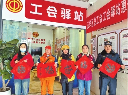 活動還邀請書法家現場揮毫潑墨,為大家送上寓意蛇年吉祥的春聯和“福”字。工會驛站里,大家圍坐一起,邊喝著臘八粥,邊休息聊天,臉上洋溢著笑容。