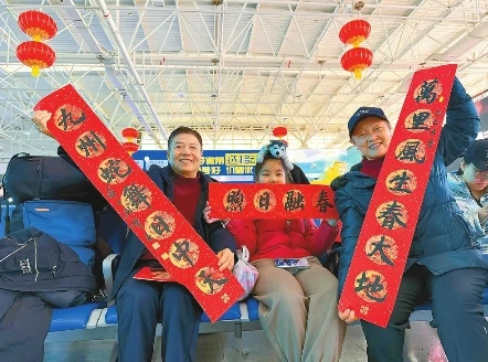圖為旅客拿到春聯(lián)喜笑顏開。