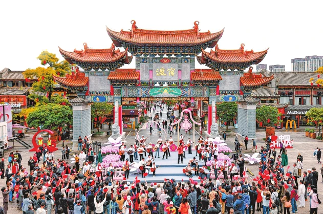 10月1日,昆明官渡古鎮舉辦百人吉他快閃活動,唱響紅色經典歌曲。 記者 胡妤雅 攝