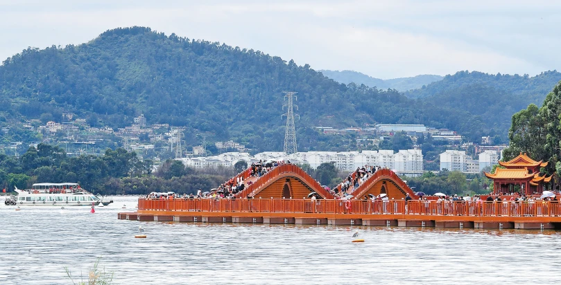 國慶中秋假期,昆明滇池綠道草海開合浮橋每日有上萬人前來爭睹514米長的“水上長虹”。 記者 楊崢 攝