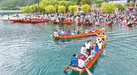 端午假期,麗江瀘沽湖景區大落水村的游船停靠點熱鬧非凡,川滇各村組群眾身著盛裝齊聚,共同開展摩梭傳統豬槽船大賽系列活動。