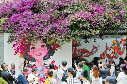 端午假期,昆明中和巷的三角梅“簪花少女”和錦鯉花墻吸引了市民和游客前來打卡。 本報記者 楊崢 攝