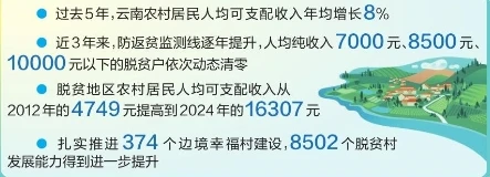 過去5年,云南農村居民人均可支配收入年均增長8%,遠高于經濟增速。脫貧地區農村居民人均可支配收入從2012年的4749元提高到2024年的16307元。