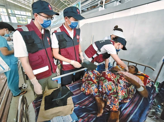 緬甸內(nèi)比都金蓮運(yùn)動(dòng)中心臨時(shí)醫(yī)院里一派繁忙。這里收治了大量骨折和外傷人員,傷情嚴(yán)重的經(jīng)過簡(jiǎn)單處理后,及時(shí)轉(zhuǎn)送到設(shè)施更完善的醫(yī)院進(jìn)一步救治。