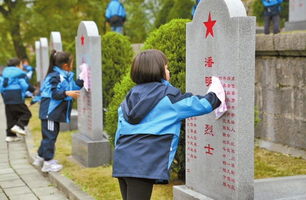 威信縣學生在扎西紅軍烈士陵園清洗墓碑。