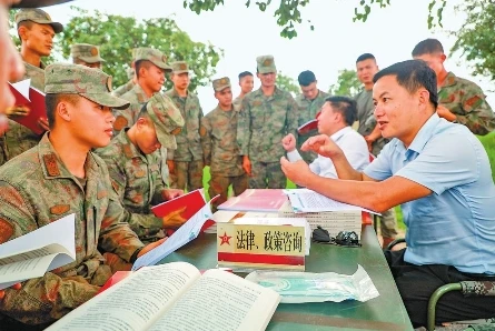 近日,在滇東北某野外訓練場,由專家組成的送法律小組為官兵普及法規、講解政策。 本報通訊員 楊昭 攝